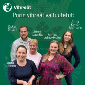 Vihreä valtuustoryhmä, varsinaiset valtuutetut: Anna Kyhä-Mantere, Oskari Siitari, Laura Pullinen, Jenni Laurila, Minka Leino-Holm